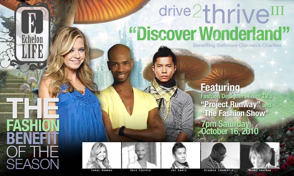 Join us as we celebrate the wonderful spirit of fashion and philanthropy in our community! Inspired by the imagination illustrated in "Alice in Wonderland", Echelon Life has created an evening to remember - fabulous fashion provided by designers from Lifetime TV's "Project Runway" and Bravo TV's "The Fashion Show", delicious dining sponsored by Milan Italian Restaurant and inspiring inductees into the Drive to Thrive Hall of Fame for Philanthropy.