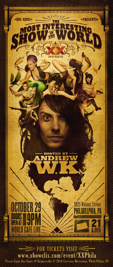 Dos XX presents The Most Interesting Show in the World. You and a guest are invited to this private invitation only event. Join us for an extraordinary evening celebrating interesting talent while the Dos XX flows at the bar. Curated by the Most Interesting Man himself, acts from around the world have been brought together for this thrilling 17-city tour. Infamous Rockstar, Andrew W.K., has been hand selected by the Most Interesting Man to host and perform in this year’s showcase. Andrew is world renown for his ability to mesmerize crowds and amplify parties. Joining Andrew on stage will be the great Hungarian Escape Artist, the Great Merlini, illusionist, Elliot Zimmet, burlesque star Mandy Lauderdale, and many other mind blowing talents. Take a look at the show! Click the link! http://www.youtube.com/watch?v=E8gDoWbN--Q EVENT IS FIRST COME FIRST SERVED. Early Arrival is strongly advised. You MUST RSVP! It is good for you & one guest...Click link below to RSVP! http://www.showclix.com/event/XXPhila