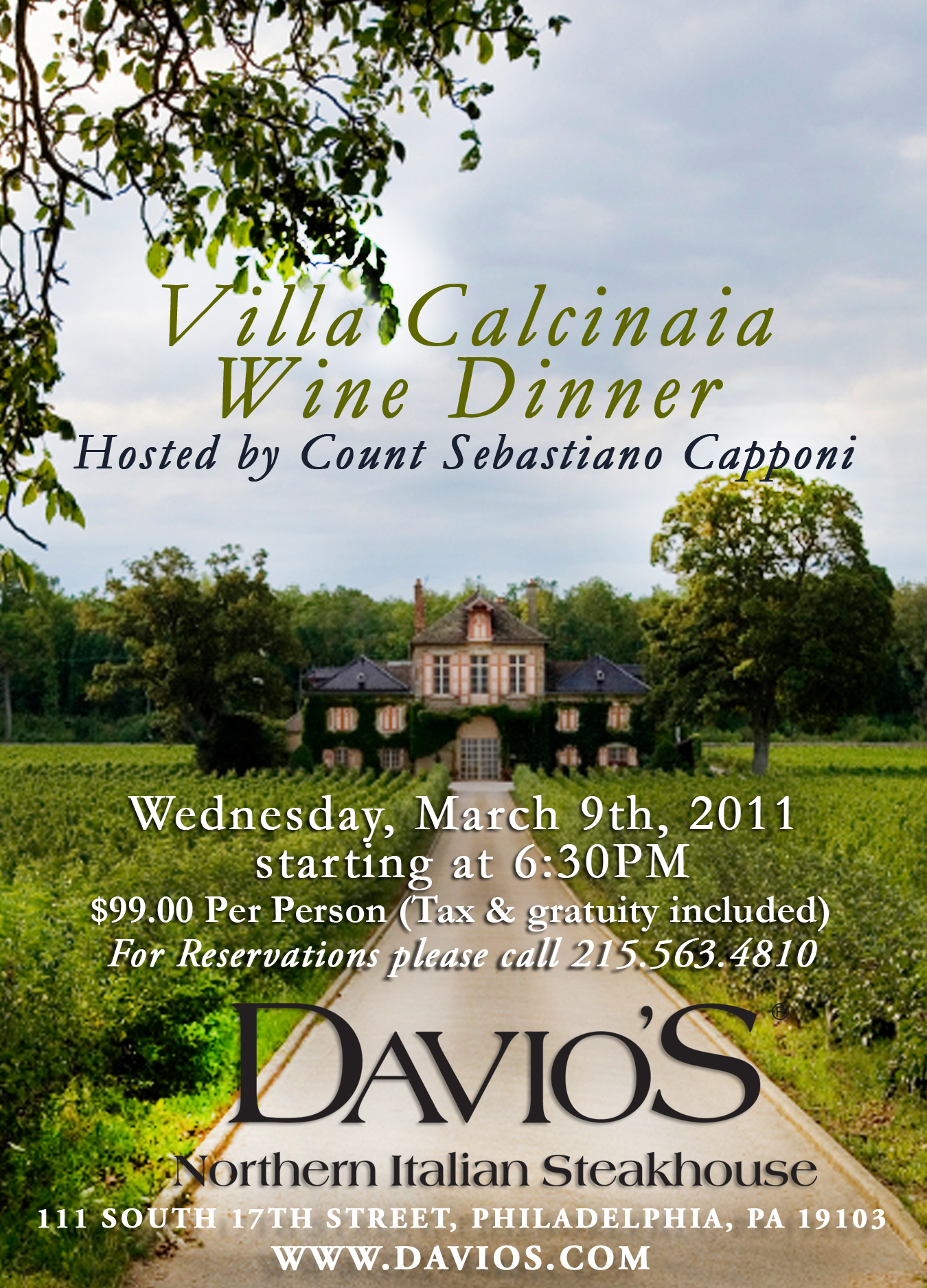 Join Davio's, Philadelphia's favorite Northern Italian Steakhouse, for an evening of Tuscan wine and culinary enchantment featuring the exclusive wines of Villa Calcinaia, the world-renowned, award-winning winery located in the heart of Tuscany, as they are presented by special guest and host of the evening, Count Sebastiano Capponi, the 20th generation of the Capponi family to run the prominent 200-hectare estate of Villa Calcinaia.