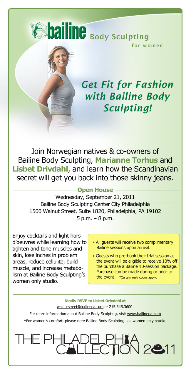 Join Norwegian natives & co-owners of Bailine Body Sculpting, Marianne Torhus and Lisbet Drivdahl, as they celebrate The Philadelphia Collection and learn how the Scandinavian secret will get you back into those skinny jeans! Enjoy cocktails and light hors d’oeuvres while learning how to tighten and tone muscles and skin, lose inches in problem areas, reduce cellulite, build muscle, and increase metabolism at Bailine Body Sculpting’s women only studio. To help guests get back into those skinny jeans, all guests will receive two complimentary Bailine sessions upon arrival. Guests who pre-book their trial session at the event will be eligible to receive 10% off the purchase a Bailine 10-session package. Purchase can be made during or prior to the event.