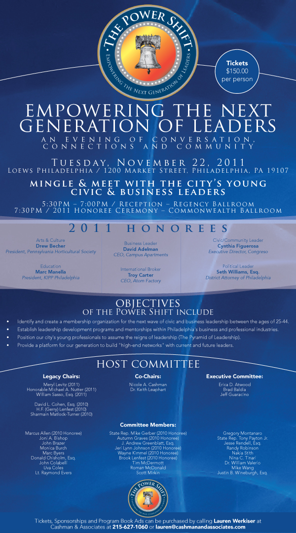 On Tuesday, November 22, 2011, The Power Shift invites guests to mingle and meet with the city’s young civic and business leaders at the Loews Hotel for an evening of conversation, connections and community. The Power Shift is an organization dedicated to strengthening the next generation of Philadelphia’s business, political and civic leaders. This year’s Power Shift co-chairs are Nicole Cashman and Dr. Keith Leaphart. The evening will begin at 5:30 p.m. with cocktails, dinner, and dessert and continue with the 2011 Power Shift Honoree Ceremony at 7:30 p.m. The Power Shift will honor six people for their exceptional leadership in their given field. Tickets are $150.00 per person. Sponsorship opportunities are also available from $2,500 to $5,000. For more information or to purchase tickets, please contact Cashman & Associates at 215.627.1060 or email Lauren@cashmanandassociates.com