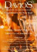 (Philadelphia, PA) - Ring in 2012 with a night out at Davio’s Northern Italian Steakhouse. Step out for a celebration worthy of a brand new year with an exquisite one-night-only à La Carte Menu from 5-7pm and Four Course Prix Fixe Menu starting at 7:30pm. Embracing classic Italian flavors and original culinary flair, Executive Chef David Boyle’s creations are sure to delight with first course items including the award-winning Philly Cheese Steak Spring Rolls, Spicy Brandt Filet Tartar or a Crispy Caprese made with local buffalo mozzarella and basil oil, the perfect beginning to a great night. For your second course enjoy one of Davio’s handmade pasta dishes such as the Penne with Applewood Smoked Chicken and delicate Hand Rolled Potato Gnocchi with Mushrooms, Reggiano Parmesan and Truffle Oil. End your meal with a treat from the Davio’s Dessert Sampler! The four-course prix fixe menu costs $125.00 per person (tax and gratuity not included). After dinner, count down to 2012 and dance the night away starting at 7:30pm at the Davio’s New Years Eve gala event in the main dining room. Start the year off right, and make this New Years the highlight of 2012!