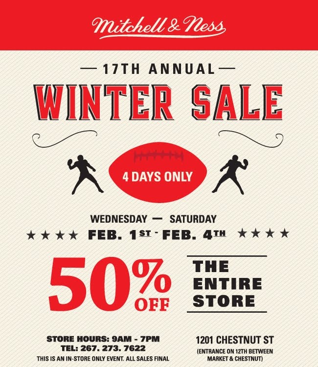Classic Philly based sports brand Mitchell & Ness presents its 17th Annual Winter Sale at the Philadelphia flagship store. For four days only, ALL men’s and women’s branded and vintage inspired team apparel and headwear will be 50% off! With the Sixers’ and Flyers’ seasons in full gear and the Phillies home opener around the corner, home town gear is sure to sell out fast! Stock up now on limited-edition outerwear, t-shirts, hooded sweatshirts, hats and jerseys before they’re gone!