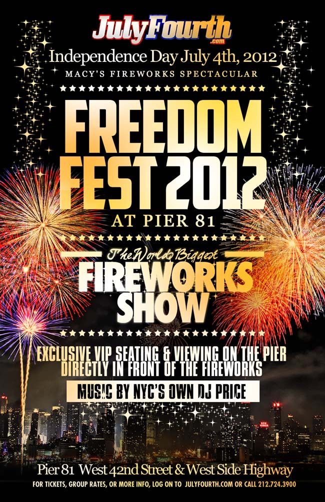 The weather has shifted in our favor, which can only lead us to one thing - the summer. Warm breezes, sunny skies, and rooftop parties all over New York City - there's nothing quite like this time of the year. July is just around the corner, meaning that one of the most anticipated days of the year will soon be here, giving us the opportunity to don the red, white, and blue, and show off just how much love we have for our country - the 4th of July. This year, rather than sticking to the typical routine which will leave you in a crowded park with tons of folks trying to fight over public grills, why not take the festivities to close to the Macy's Fireworks action by attending Freedom Fest? This is quite possibly the best party to attend for 4th of July this year in New York City. You can bring the entire family to this event that features a massive BBQ and cash bar on Pier 81, the closest and best position you could ask for to catch the spectacle that is the Macy's Fireworks show. It's literally less than 1000 feet from the barge! Freedom Fest is presented by JulyFourth.com, and if you're familiar with their events, you should know that they don't get much better. Just be sure to get your tickets as soon as you can - there's no telling when they'll sell out! ***TICKET PICK-UP INSTRUCTIONS*** The print-out is only your confirmation. Please bring your confirmation, credit card used to purchase ticket(s), and a government issued ID to pick up your actual pier pass our box office located at: JulyFourth.com 303 West 42nd Street [Suite 507] Corner of 8th Avenue New York, New York 10036 Monday, June 25th until Monday, July 2nd during the hours of 11am and 7pm. You MUST pick up your PIER PASS [OR PASSES] at our box office. You will not be able to access the pier without your PIER PASS.