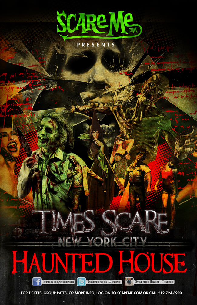 The culmination? Sawing a child-volunteer in half with a real power saw! At the end of the show everyone gets free tricks to share with the whole family and friends. The audience will also have a chance to get made-up to look like zombies, just so they can get back outside the walls of Times Scare and really show the street-folk a sight to see.