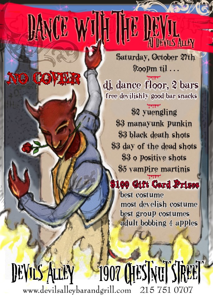 Devil’s Alley Bar & Grille, 1907 Chestnut Street,  kicks open its fiery gates for a red hot night of Halloween mischief.  On Saturday, October 27, 2012, the Devil himself invites you to show off your devilish side for the Dancing with the Devil Party.  From 9:00pm to 2:00m, the Devil mixes tunes on the dance floor and spirited drinks at the bar.  Festivities will include a DJ, dancing, costume contest, free prizes, adult apple bobbing, drink specials, free snacks, Skyy models, Skyy shots and more. Party is free and open to ages 21 and older. For more info, call (215) 751-0707, visit www.devilsalleybarandgrill.com , follow @devilsalley on Twitter or like “Devil’s Alley” on Facebook.com.