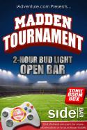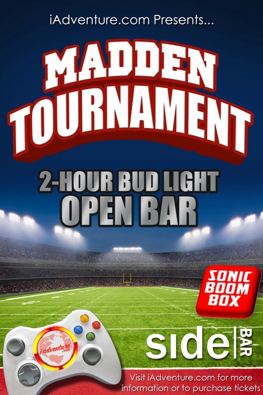From the folks who brought you the Selection Sunday Flip Cup Tournament, iAdventure.com is teaming up with Sonic Boom Box for the Madden Tournament coming to NYC on Saturday, January 26th at SideBar. Play in the tournament where you and your opponents will compete for a chance to win a grand prize & a second place prize. Tickets get you access to the tournament with a 2-Hour Bud Light Open Bar, Bar Snacks and iAdventure.com swag.