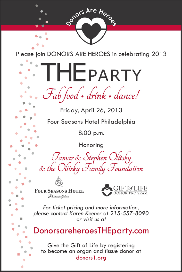 Celebrate National Donate Life Month with a fun night of cocktails, dancing and food from Philadelphia’s finest eateries at the Donors Are Heroes 11th Anniversary THE Party. The event will take place on Friday, April 26th at 8:00 PM at the Four Seasons Hotel in Philadelphia.