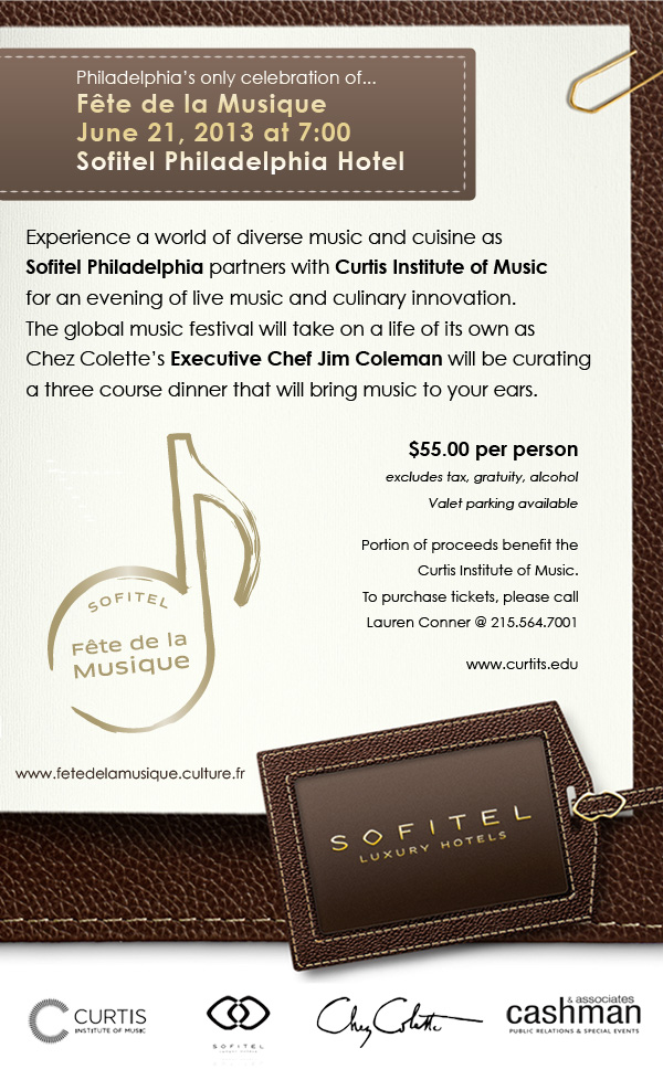 In true modern, chic Sofitel style, Executive Chef Jim Coleman has crafted a musically delicious menu to serve to guests at a specialty dinner to mark the occasion. Each course will have an optional wine pairings and the music of the evening will gracefully guide the service. Students from Philadelphia’s own world-renowned Curtis Institute will construct the musical translation of the menu and serve as a guide for the dinner.