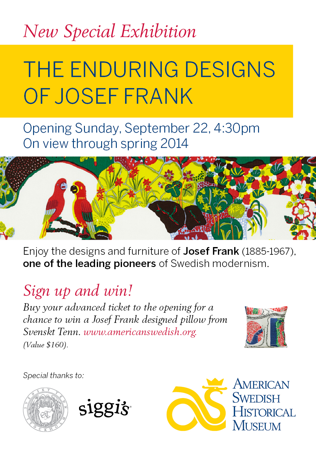 WIN! Buy your advanced ticket for a chance to win a Josef Frank designed pillow from Svenskt Tenn (value $160). www.americanswedish.org/calendar or 215-389-1776.