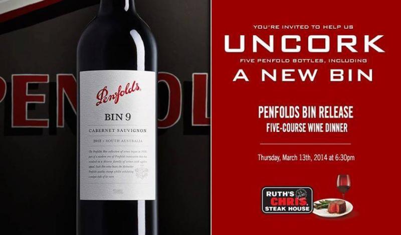 On March 13,. On March 13thRuth's Chris Steak House partners with Penfolds to celebrate the inaugural release of a brand new Bin – Penfolds Bin 9. In addition, Penfolds hosts will be unveiling the stories behind each of the Bin numbers on four additional allocated Bins, all perfectly paired in a five course dinner. This will be an unforgettable evening of food, wine and story-telling," said Helen Mackey, Vice President of Menu Strategy and Innovation for Ruth's Chris Steak House.