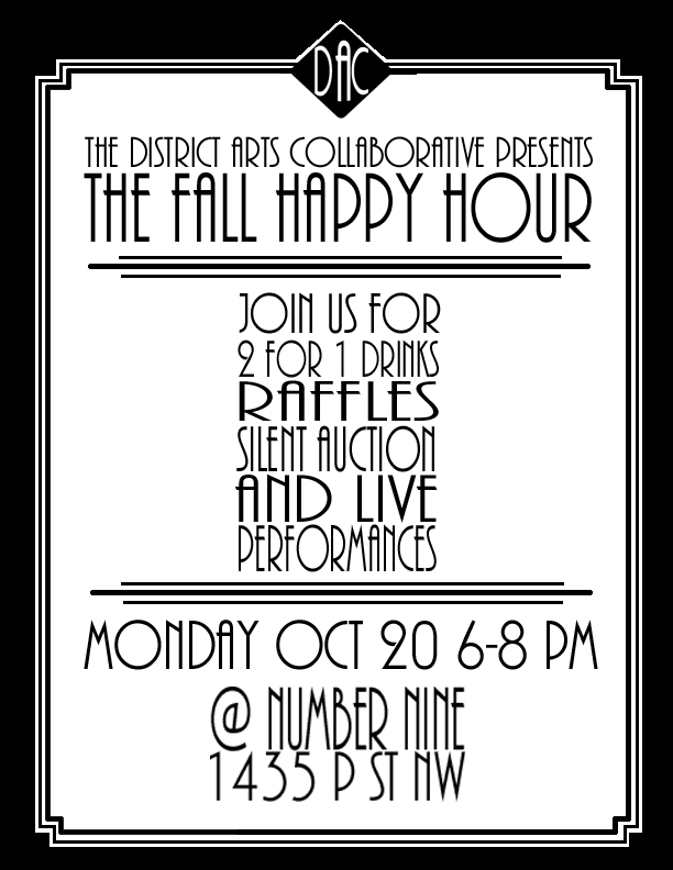 The District Arts Collaborative invites you and everyone you know (of legal drinking age) to their Fall Happy Hour. The night includes 2 for 1 drinks, a raffle, silent auction and live performances from DAC pals. The silent auction will have a variety of items available for bidding including theatre tickets, behind-the-scenes tours and more.  Also available for purchase are tickets to the District Arts Collaborative’s upcoming show The Last Five Years written by Jason Robert Brown and directed by Justin Becker.  The DAC Fall Happy Hour will take place October 20, 2014 from 6 to 8 pm at Number Nine, 1435 P St NW.