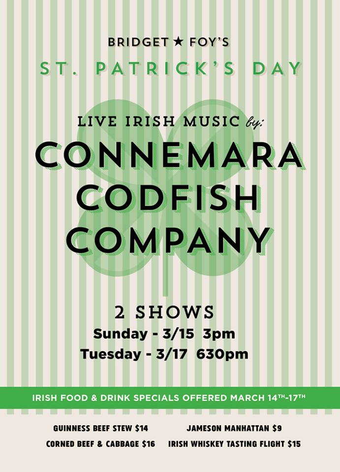 Celebrate the luck of the Irish on Sunday, March 15, 2015 at Bridget Foy’s (200 South Street) with food and drink specials, including Guinness Beef Stew, Corned Beef and Cabbage, Seamus Irish Red Ale, Donnybrook Stout Drafts, Irish Whiskey Flights - plus 2Gingers Whiskey for $5.00. Connemara Codfish Company presents free Irish music at 3:00pm. Doors for brunch, lunch and the bar open bright and early at 10:00am. Enjoy a table on the patio and watch the brigades come down South Street after Philadelphia’s St. Patrick’s Day Parade. Free admission, with food and drink pay-as-you-go. 21 and up (with identification) to drink. For more info, visit www.bridgetfoys.com, tweet @BridgetFoys, or call 215-922-1813.