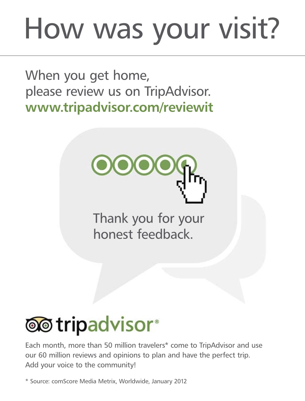 If you have been approached or contacted by a company offering to boost your ranking, provide content or reviews to your listing or any activity that would violate TripAdvisor's policies, we would like to hear from you. Any information you provide, no matter how minor, can assist us in our investigations. All reports should be made to our Content Integrity team and will be investigated and kept confidential. With your help, we can continue to improve the service TripAdvisor provides to travelers.