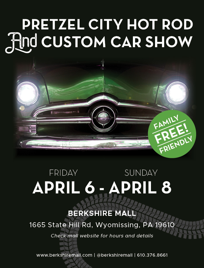 Pretzel City Rod & Custom Car Show comes to the Berkshire Mall on Friday April 6th until Sunday April 8th. Stop by to check out the hottest cards in town! The event is free and family friendly.