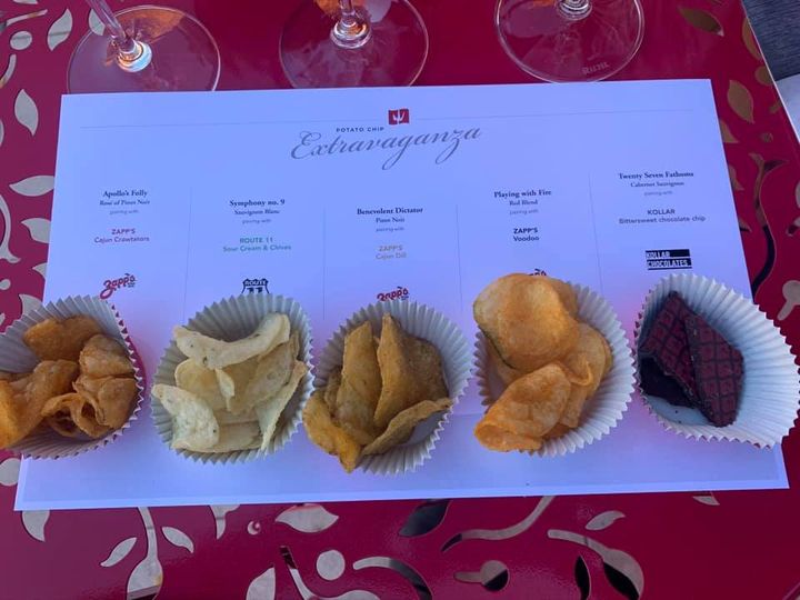 In the COVID era, wine tasting rooms are getting more and more creative to attract guests. Silver Trident has a new offering that caught my attention immediately, The Potato Chip Extravaganza. If you're a fan of chips and like to have sips, then I've found the perfect wine tasting experience for you. It features five different artisanalpotato chips paired with five Silver Trident wines.