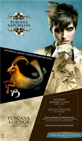 TERRY FRASIER & ERIC TAYLOR PRESENTS TUSCANA SATURDAYS THE WORLDS LARGEST CAPRICORN BIRTHDAY BASH SPECIAL BIRTHDAY CELEBRATION FOR: NAJEEMA D.W. THOMPSON QUEEN MALAIKA REUBEN WILSON VINCENT PEDEN ATTIRE: CLASSY & DISTINGUISHED SATURDAY JANUARY 16, 2010 11:00PM - 3:00AM EVERY SATURDAY! VALET PARKING AVAILABLE PLEASE RSVP FOR COMPLIMENTARY ADMISSION UNTIL MIDNIGHT WITH YOUR LIST OF NAMES TO TUSCANALOUNGE1@GMAIL.COM PLEASE INVITE YOUR FRIENDS AND MAKE IT YOUR PARTY! FOR TABLE RESERVATIONS & BIRTHDAY CELEBRATIONS PLEASE EMAIL TUSCANALOUNGE1@GMAIL.COM OR CALL 718-450-1803 TUSCANA WEST 1350 I(EYE) STREET NW WASHINGTON DC 202.289.8843 WWW.TUSCANALOUNGE.COM