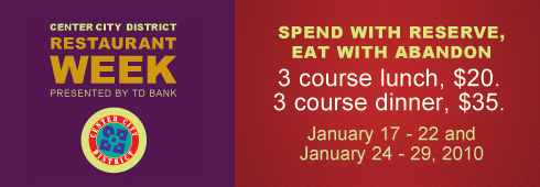 Center City District Philadelphia Restaurant Week-Sample the finest restaurants and most talented chefs in the country, during Center City District Restaurant Week presented by TD Bank. For two weeks, January 17-22 & 24-29, enjoy some of the city’s best cuisine at just $35 for three courses (not including tax, gratuity or alcohol). In addition, many of the participating restaurants will also offer a three-course lunch for $20. Get a full list of restaurants, see menus and make online reservations at the official CCDRW Web site. http://www.opentable.com/promo.aspx?m=13&ref=501&pid=95&ref=1081