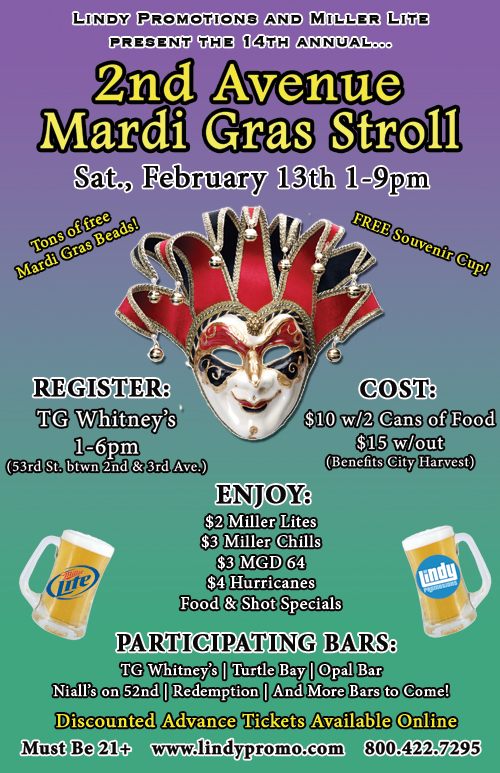 For years we've transformed 2nd Ave. in Midtown into Manhattan's version Bourbon Street, as hundreds partiers bar hop, booze and "earn" beads in celebration of Mardi Gras! Come party with us this year as we do it even bigger and better than before...