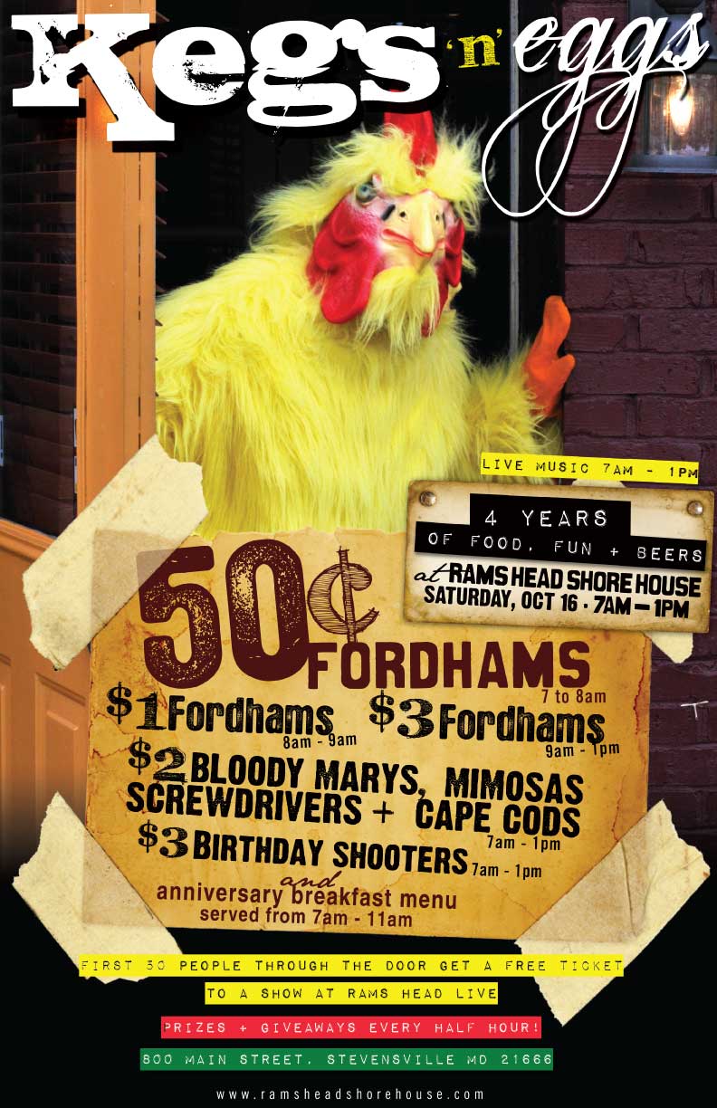 Rams Head Shore House is pleased to announce the celebration of 4 successful years. In celebration, Rams Head will open its doors at 7am on Saturday, October 16th for a company tradition of “Kegs n’ Eggs”.