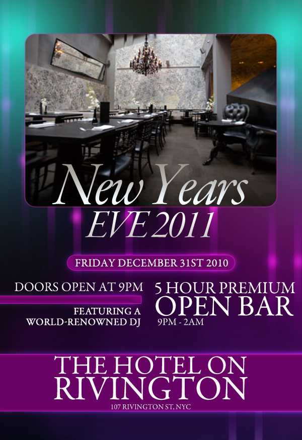 - Complimentary Admission to The Official NYE 2011 After      Party at TBD starting at 3AM. (A $35 value – FREE with your Hotel Rivington ticket      stub!)