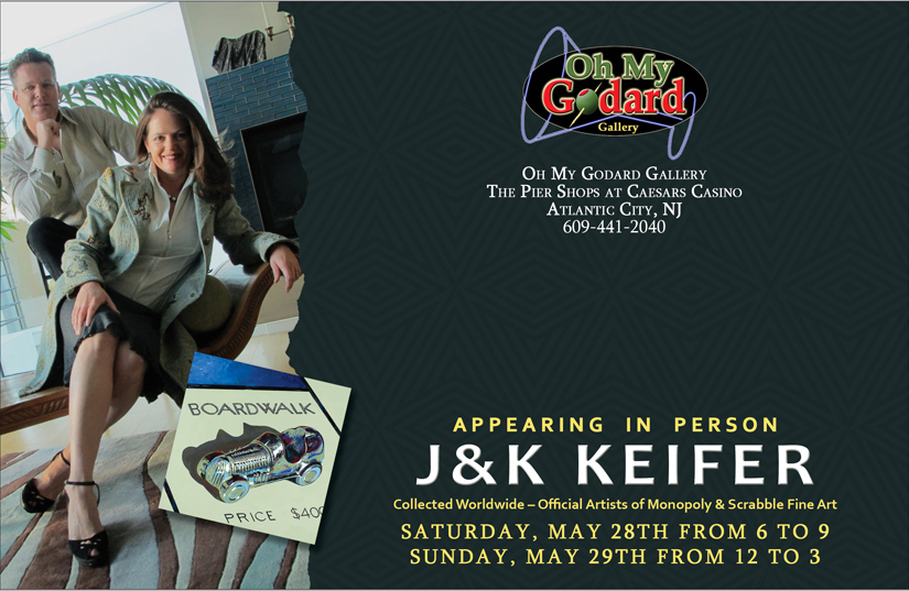 Join the Oh My Godard Gallery on May 28th and May 29th, when artists J&K Keifer bring The Art of the Game to the boardwalk. During this exclusive in-store appearance, these internationally acclaimed artists will be signing their limited-edition collection, “Art of the Game.” Come experience these colorful paintings and prints as Jim and Kathleen (J&K) Keifer capture the excitement of a Royal Flush or the satisfaction of winning at Scrabble or Monopoly, with a touch of famous Atlantic City Boardwalk fun. Art lovers who play to win will be able to meet the Keifers and purchase signed works. A special collector’s gift will be given with purchase, and a portion of the evening’s proceeds will be donated to the Gilda’s Club South Jersey Noogieland, a support program for children living with cancer.
