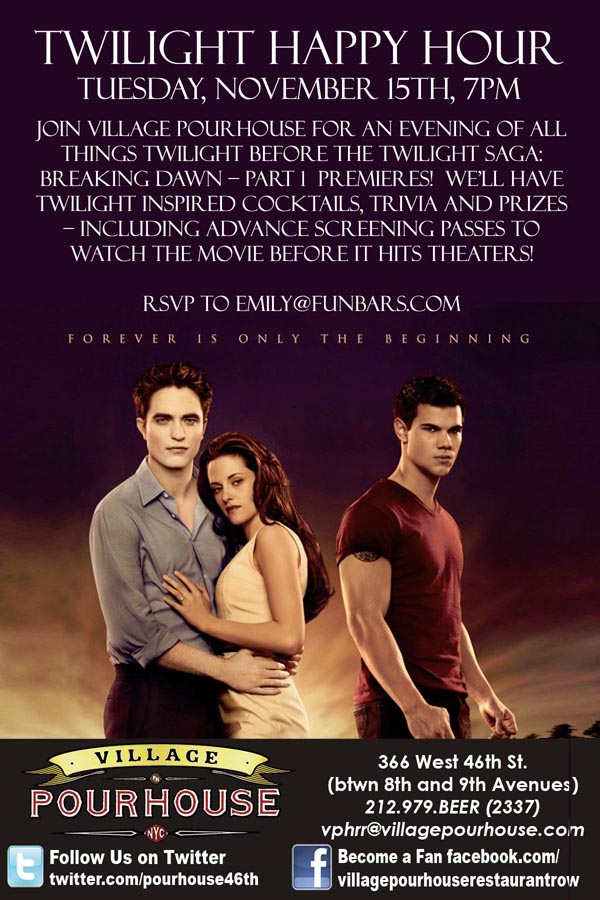 Join Village Pourhouse for an evening of all things Twilight before The Twilight Saga: Breaking Dawn – Part 1 premieres! We’ll have Twilight inspired cocktails, trivia and prizes – including some advance screening passes to watch the movie before it hits theaters!