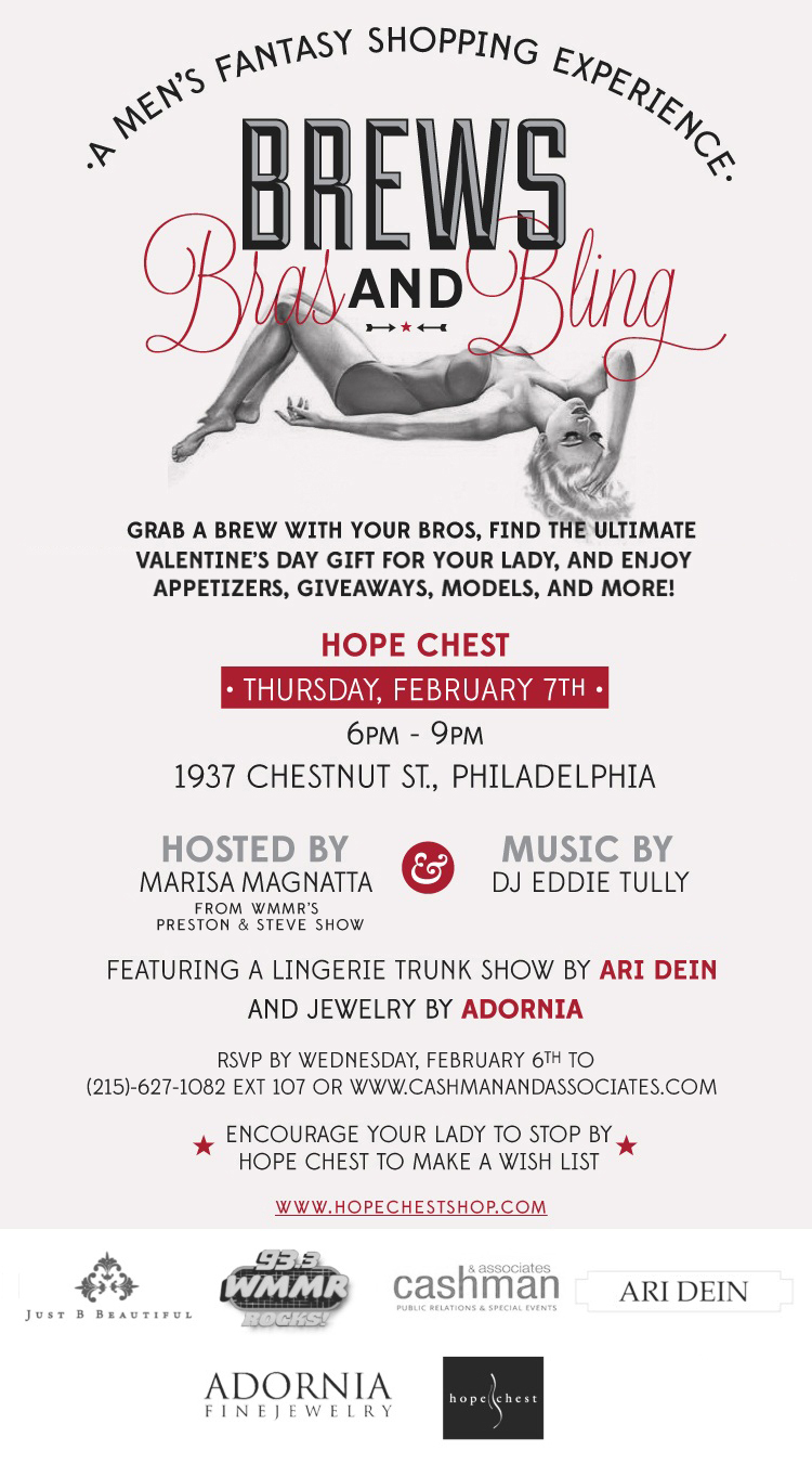 Just in time for Valentine’s Day, Philly’s premier lingerie boutique, Hope Chest, is hosting a man’s fantasy shopping event—‘Brews, Bras, & Bling.’ From cocktails, to in-store promotions, to jewelry, free gifts, music, and more, Hope Chest is men’s go-place for all their Valentine’s Day needs.