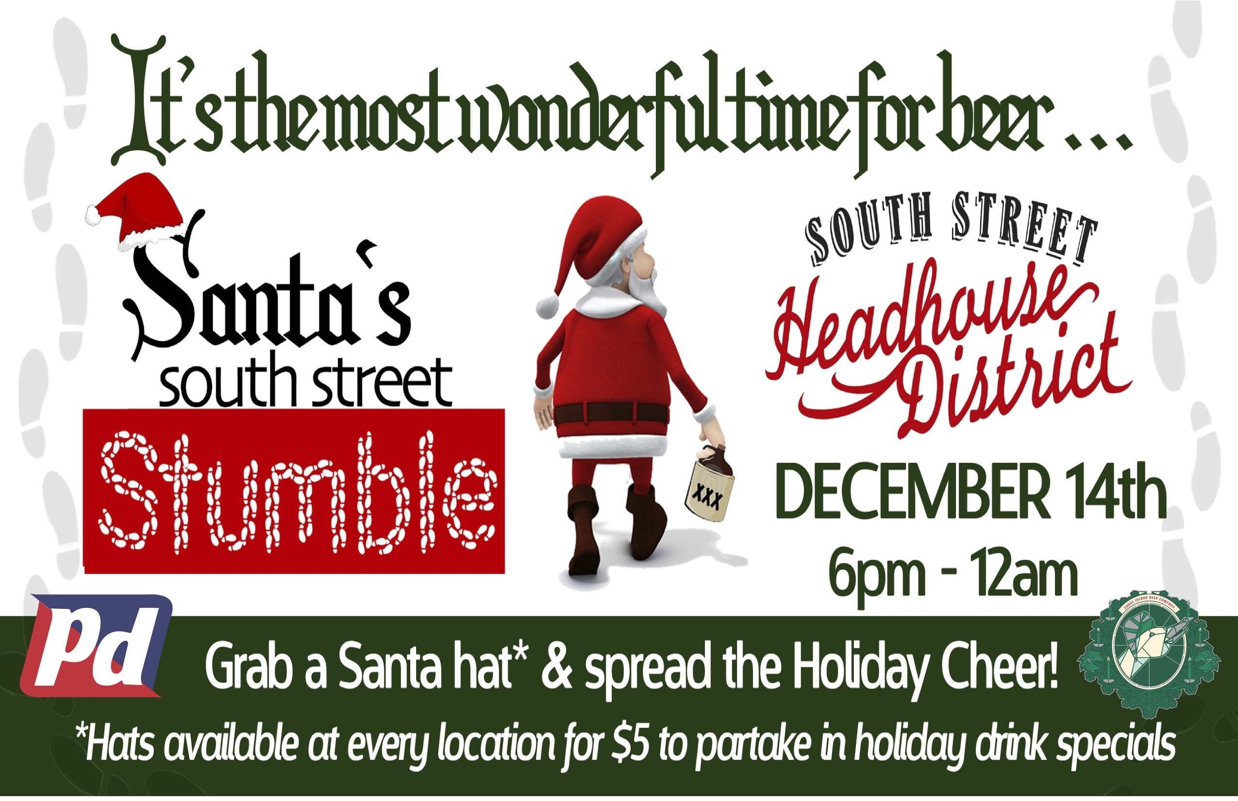 It’s the most wonderful time for beer! South Street Headhouse District will be filled with the sounds of jolly laughter as hundreds of Santas partake in the annual Santa’s South Street Stumble on Saturday, December 14, 2013, from 6:00pm to Midnight. For only $5.00, guests will receive a special SSHD Santa hat, available at the Headhouse Square Shambles until 9pm or at any participating bar, that entitles them to discounted drinks and cocktails at 13 bars and restaurants. Proceeds will benefit the John S. and James L. Knight Foundation, Knight Arts Challenge Grant. Stumble will happen rain or shine, and is open to participants 21 and older with valid identification. For a list of participating bars and restaurants, visit southstreet.com, call (215) 413-3713 or follow @officialsouthst on Twitter.