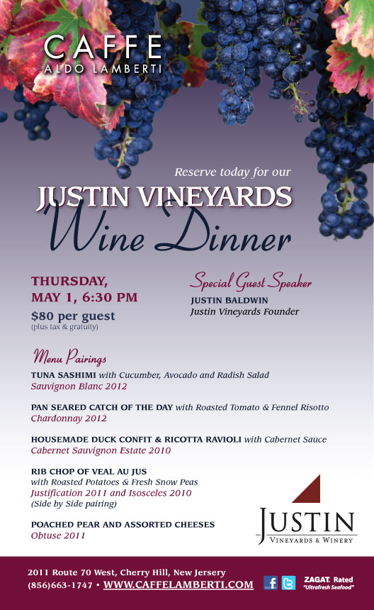 Make your reservation today to attend our upcoming Justin Vineyards Wine Dinner on Thursday, May 1st, 2014. Guest Speaker will be Justin Baldwin, Founder of Justin Vineyards. Menu features 4 Courses, each paired with complementing wines, plus dessert. Menu highlights include: Tuna Sashimi, Rib Chop of Veal & Housemade Duck Ravioli. Cost is $80 per guest (plus tax & gratuity).