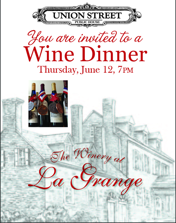 Union Street Public House and The Winery at La Grange are teaming up to bring you a 5-course dinner on Thursday, June 12. Chef Gregory Payne has prepared a delectable seasonal menu and Winemaker Fletcher Henderson will guide diners through the five wines selected, including La Grange Viogner, exclusive to this dinner as it has not been released to the public yet.  This 5-course dinner is $70 per person, $63 for USPH Wine Club members, and includes tax and gratuity. Space is limited and priority will be given to our Wine Club Members.