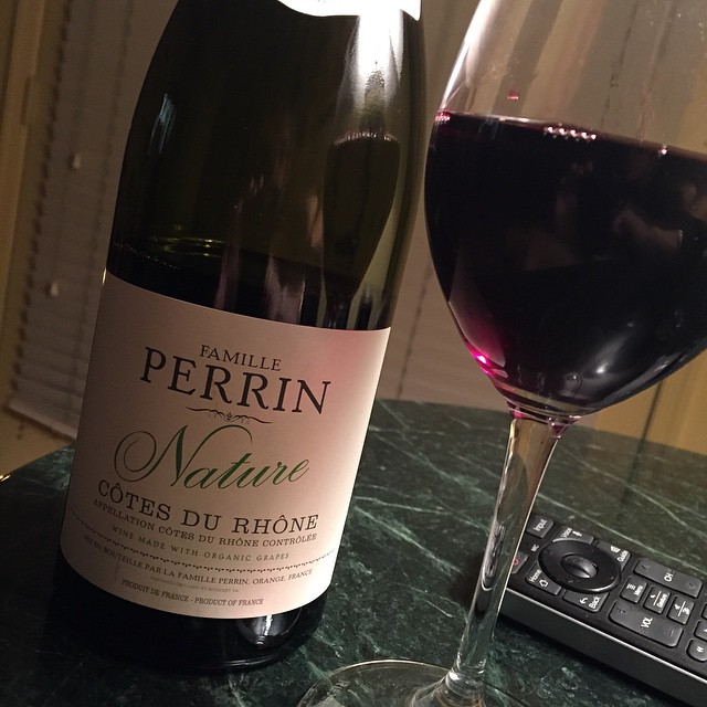 Famille Perrin Cotes du Rhone Nature is so-called because it is made from organically grown grapes. Often getting migraines from red wine, I am always seeking out new wines to try. This not only tasted marvelous, no headache!